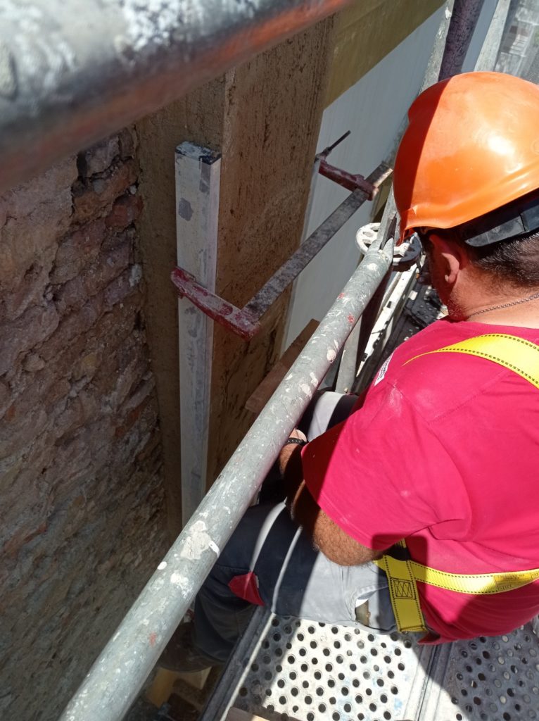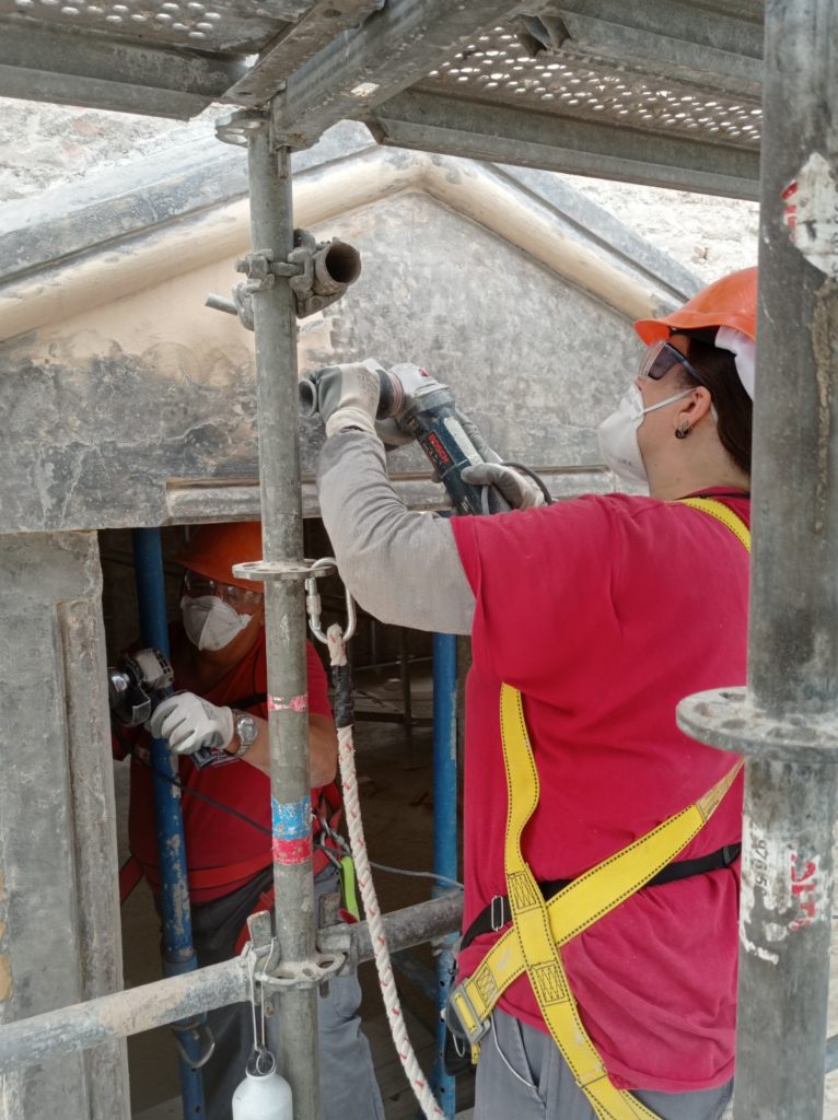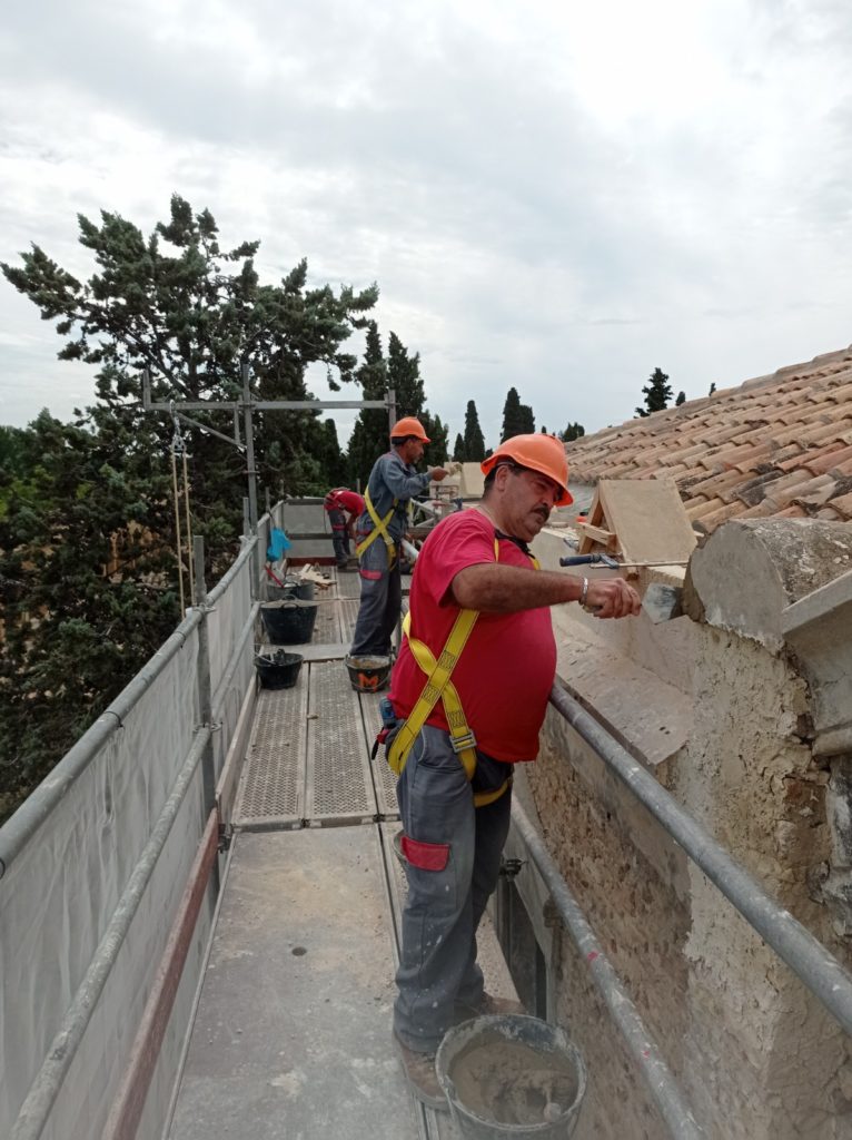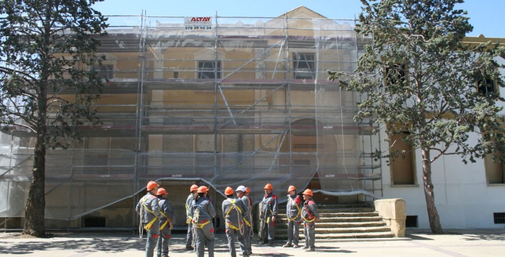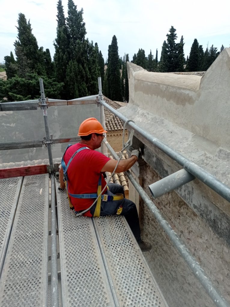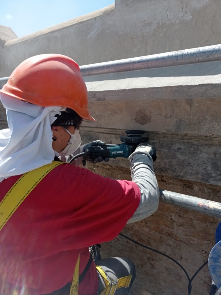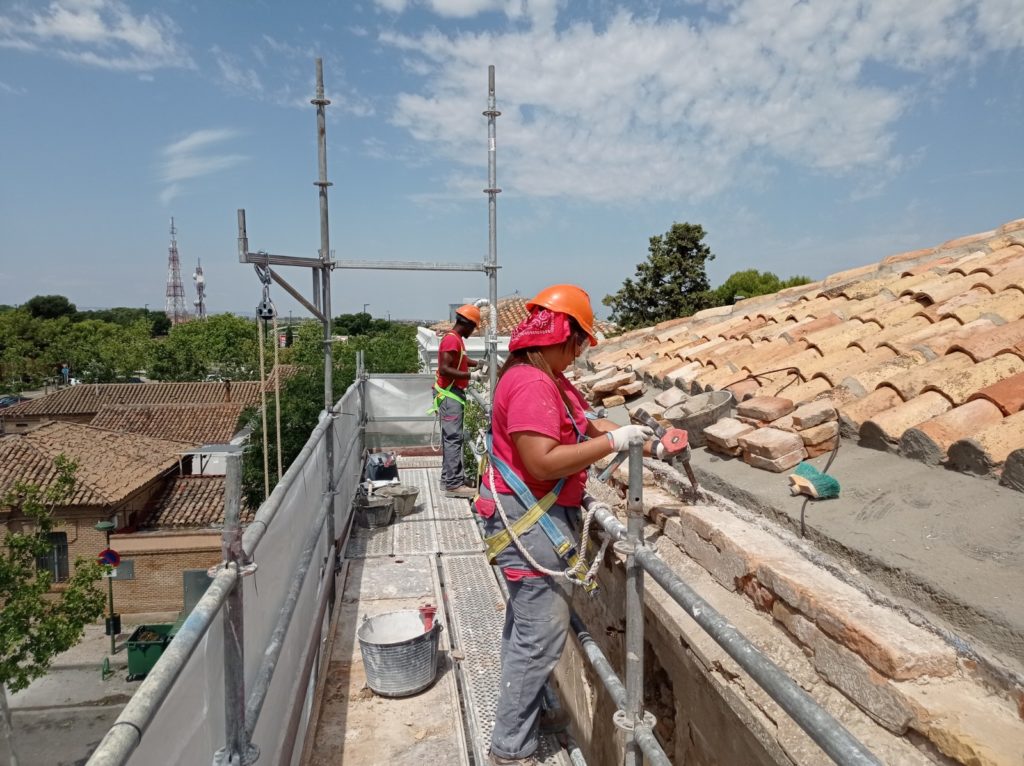 Por una lado, se han montado andamios para acceder a los trabajos de la fachada norte y la fachada oeste. En esta última se trata de completar los trabajos que ya se dejaron pendientes hace unos años, con otra edición de proyectos formativos.