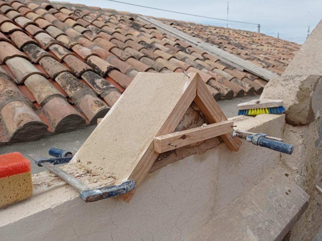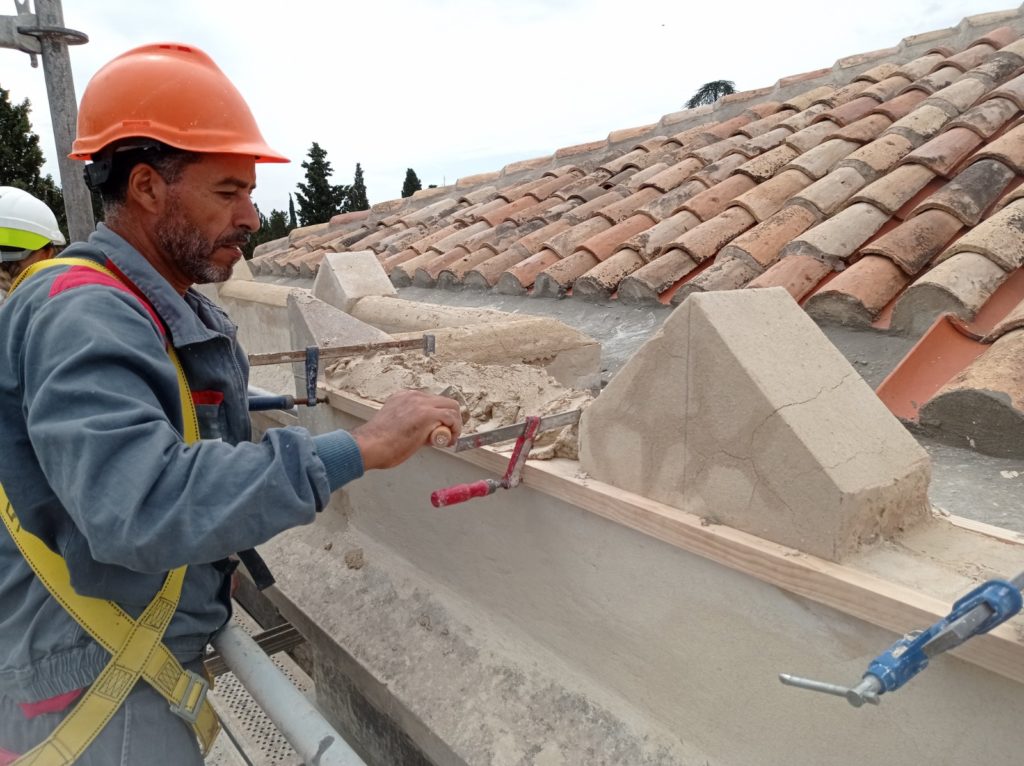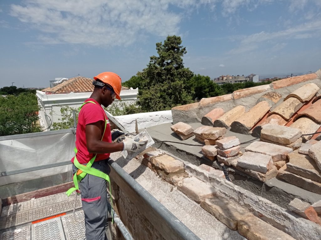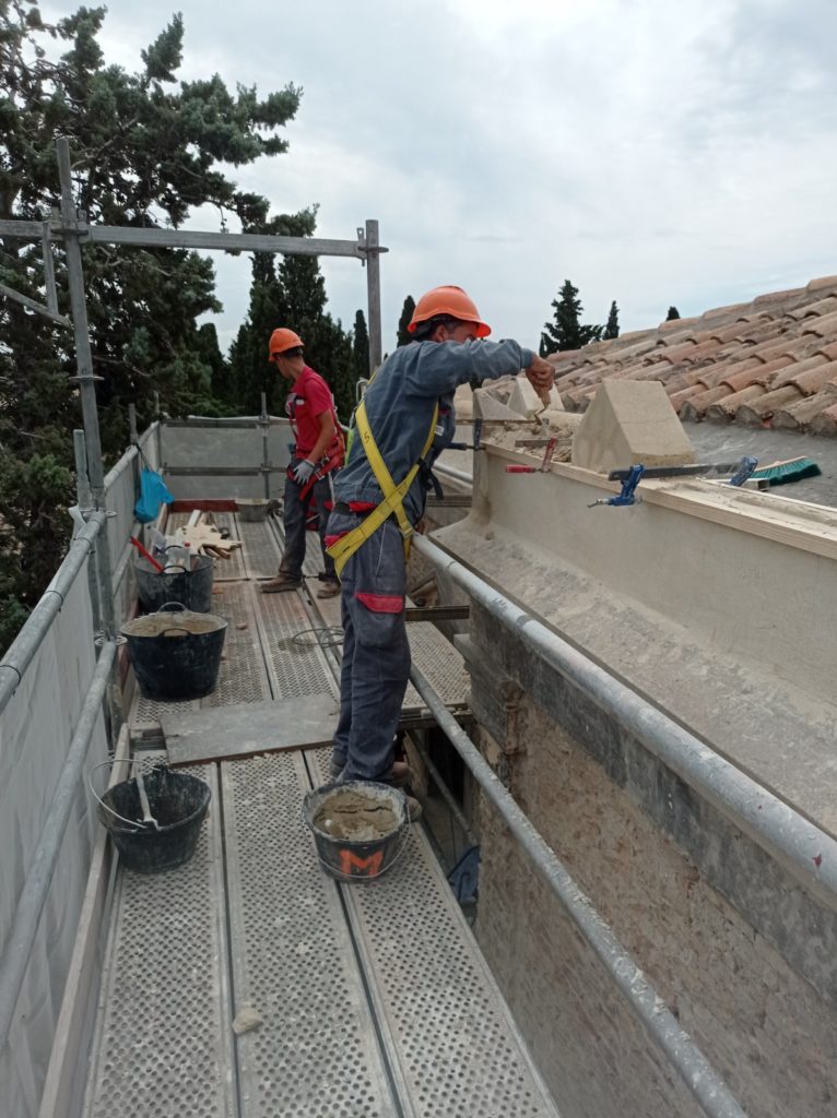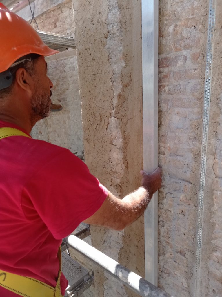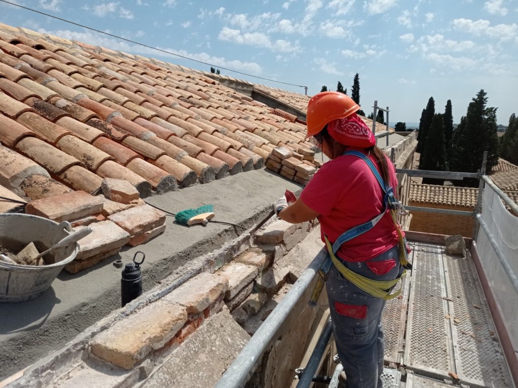 Por una lado, se han montado andamios para acceder a los trabajos de la fachada norte y la fachada oeste. En esta última se trata de completar los trabajos que ya se dejaron pendientes hace unos años, con otra edición de proyectos formativos.