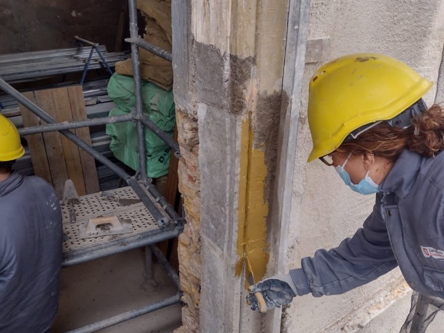 Un aspecto importante de los trabajos en la fachada está siendo los rasgados de las ventanas y la construcción de las molduras que tienen que completar los nuevos huecos. En